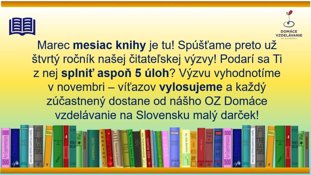 Marec je mesiac knihy a my spúšťame už piaty ročník domškoláckej čitateľskej výzvy! Účastníci v nej plnia zadané čitateľské úlohy, dané témy spracujú spôsobom podľa vlastného výberu a svoje práce posielajú mailom do OZ DVS. Každý účastník získa malý darček od OZ DVS, vylosovaní víťazi darčekovú poukážku na nákup v kníhkupectve Martinus. Všetky prečítané knihy spracujeme do článku ako tipy na čítanie pre ďalších domškolákov. Výzva nie je klasickým nudným čitateľským denníkom. Jej úlohou je podporiť čítanie detí (detí s rodičmi) a kreatívne spracovanie obsahu knihy podľa určených zadaní. Žiadne spracovanie nie je nesprávne 🙂